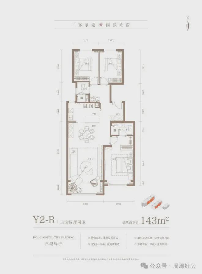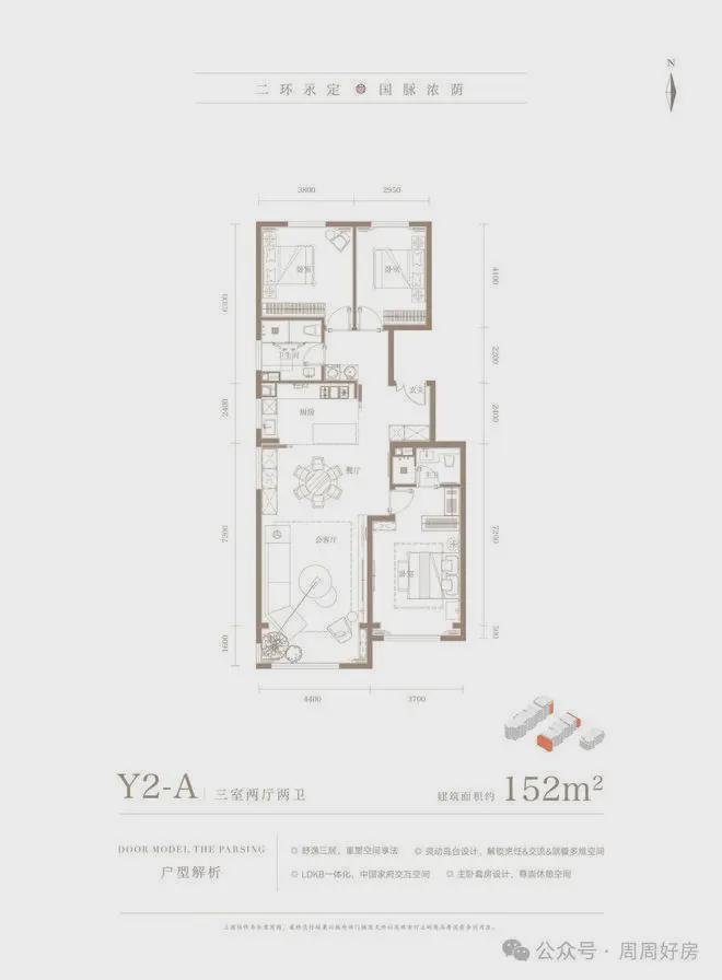 ①采用了南向双面宽设计,客厅宽阔,配有4.4米宽幕观景窗;②LKD一体化布局使空间利用更为合理