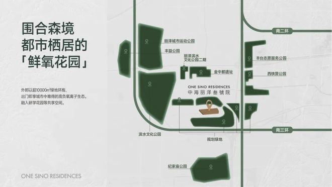 向北约1km可以到达丽泽商务区70亩中心公园以及莲花河滨水绿地,约7km内有历史名园玉渊潭公园、5A天坛公园。