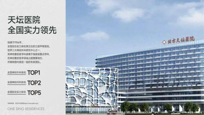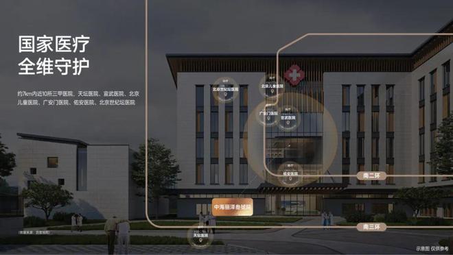 约7公里范围内近10所三甲医院:天坛医院、被誉为国内“中级诊断机构”的宣武医院、三级甲等的北京儿童医院、以中医为主的广安门医院、佑安医院、北京世纪坛医院、北京电力医院等。