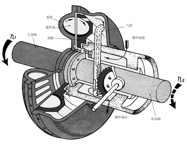 小时候都玩过风车吧,拿着小风车放在电风扇前边,风车也会被吹的转起来,电风扇转越快,风车也会转的越快。液力耦合器就是这个原理,只不过吹的不是风,而是油。液力耦合器最主要的部件是泵轮和涡轮。两者长得差不多,都是一个碗里边插着许多叶片,而泵轮和涡轮之间则被油液填满。