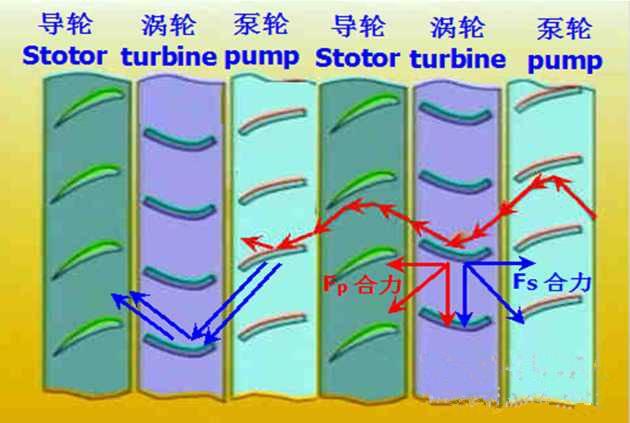 如下图,泵轮作为主动轮,叶片推动油液冲击到涡轮上,产生了Fp红色的力,之后经过涡轮叶片的导向,油液变换方向继续流向固定的导轮,冲击在导轮叶片上,产生反作用力Fs蓝色的力。