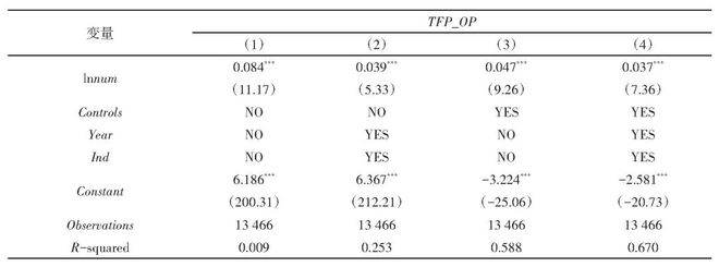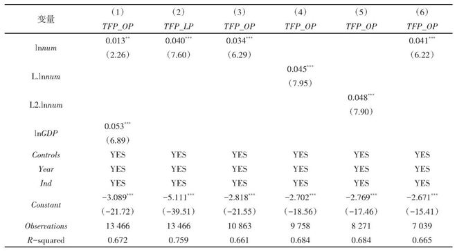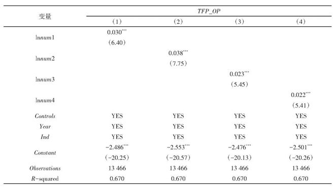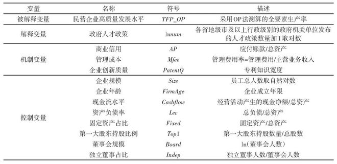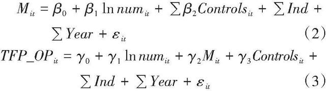 式(1)中:i代表公司;t代表年份;TFP_OPit代表被解释变量企业高质量发展水平;lnnumit代表解释变量人才政策;Controlsit代表控制变量;Ind代表行业固定效应;Year代表时间固定效应;εit为随机扰动项。