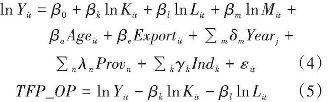 式(4)—(5)中:Y代表企业总产出,用营业收入来衡量;K代表企业资本投入,用固定资产净额来衡量;L代表企业人力资本投入,用员工人数来衡量;M代表投资额,用固定资产投资来衡量;Age代表企业年龄;Export代表是否参与出口,用企业是否有海外销售收入来衡量;Year、Ind和Prov分别表示年度、行业和省份;ε为残差项,包括生产函数无法体现的随机干扰因素等。