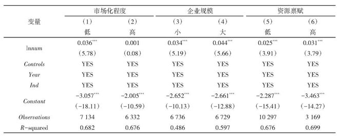 政府人才政策会因市场化程度的不同而呈现出差异化的效果。本文以樊刚市场化指数的中位数为界线,将区域环境划分为市场化程度高的环境和市场化程度低的环境两类,对不同环境的企业进行分组回归,表6中列(1)—(2)为政府人才政策在不同市场化程度下的实施效果。可以看出,在市场化程度低的环境中,政府人才政策的实施效果更为显著。原因可能是,市场化程度高的区域要素资源丰富、信息获取便捷,企业往往能够较为容易地得到所需人才资源,因此人才政策的作用相对较弱。相反,在市场化程度较低的区域,民营企业更加依赖人才政策扶持,政府通过加大政策支持力度,吸引和留住人才,为民营企业发展提供有力的人才保障。这表明,人才政策的制定需要充分考虑区域的市场化程度和发展环境,以符合当地实际情况。